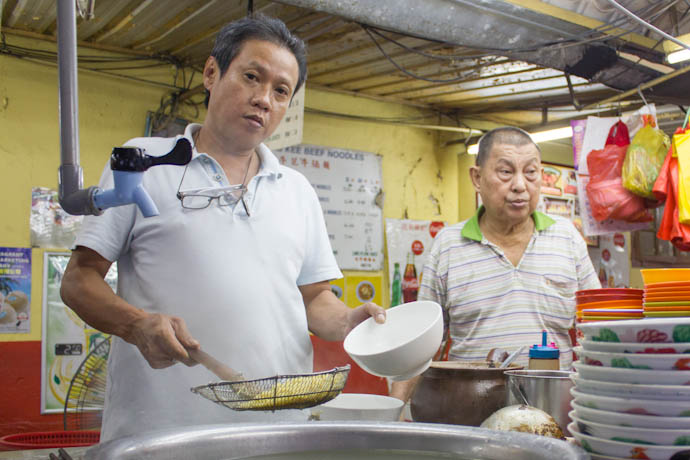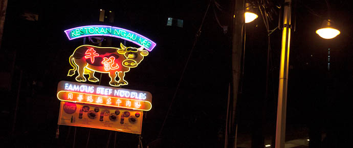 這家位於同善路(Tengkat Tong Shin)上的「牛記牛肉粉」,從1970年代創業至今,已將近半世紀的歷史。「牛肉粉」(粵語)也就是牛肉麵,偌大的「牛記」霓虹燈招牌,成了這家老店最醒目的標誌。來到這裡不吃一碗湯頭鮮濃的「牛雜粉」或「牛肉丸粉」,可就走寶了。