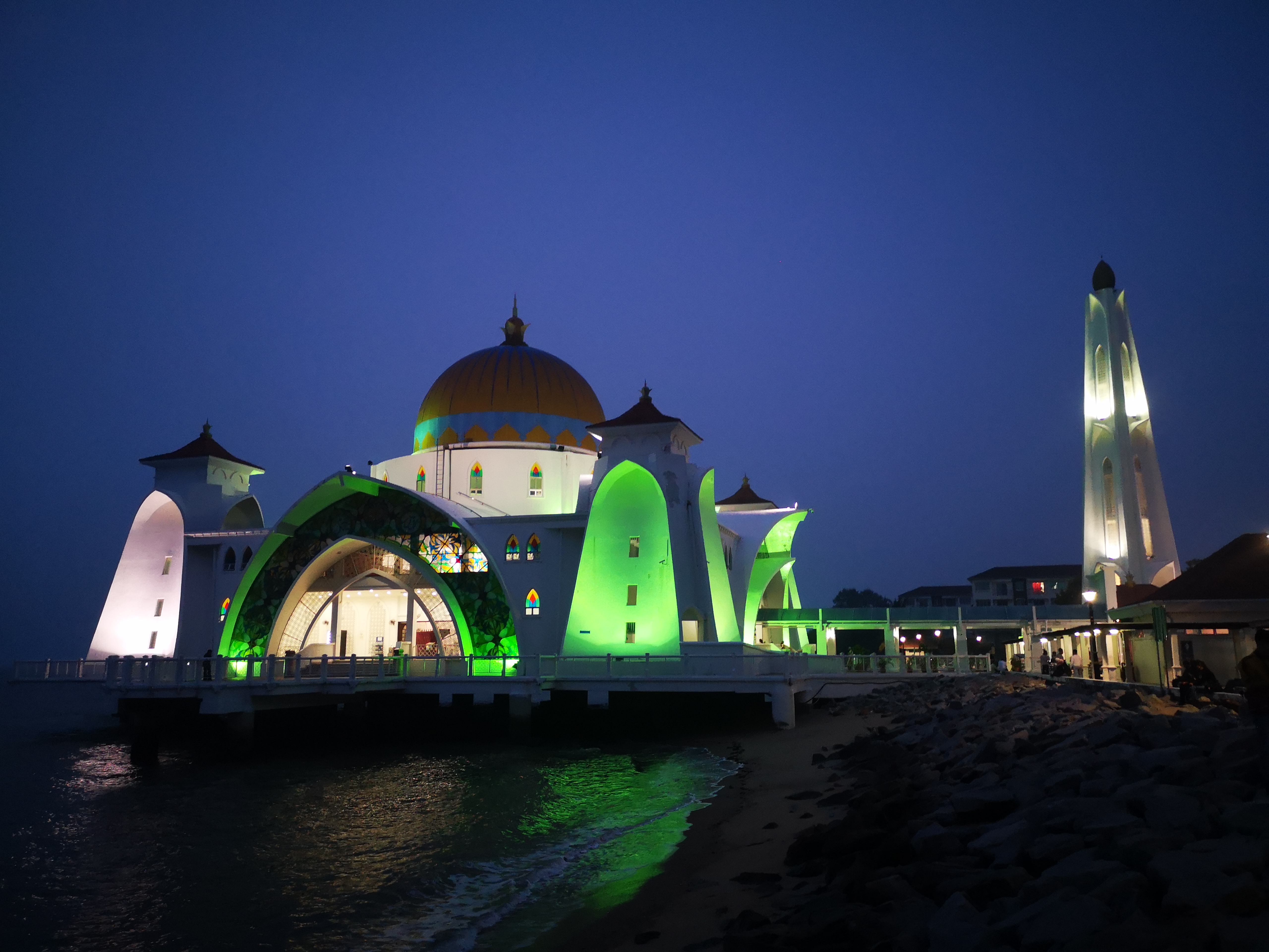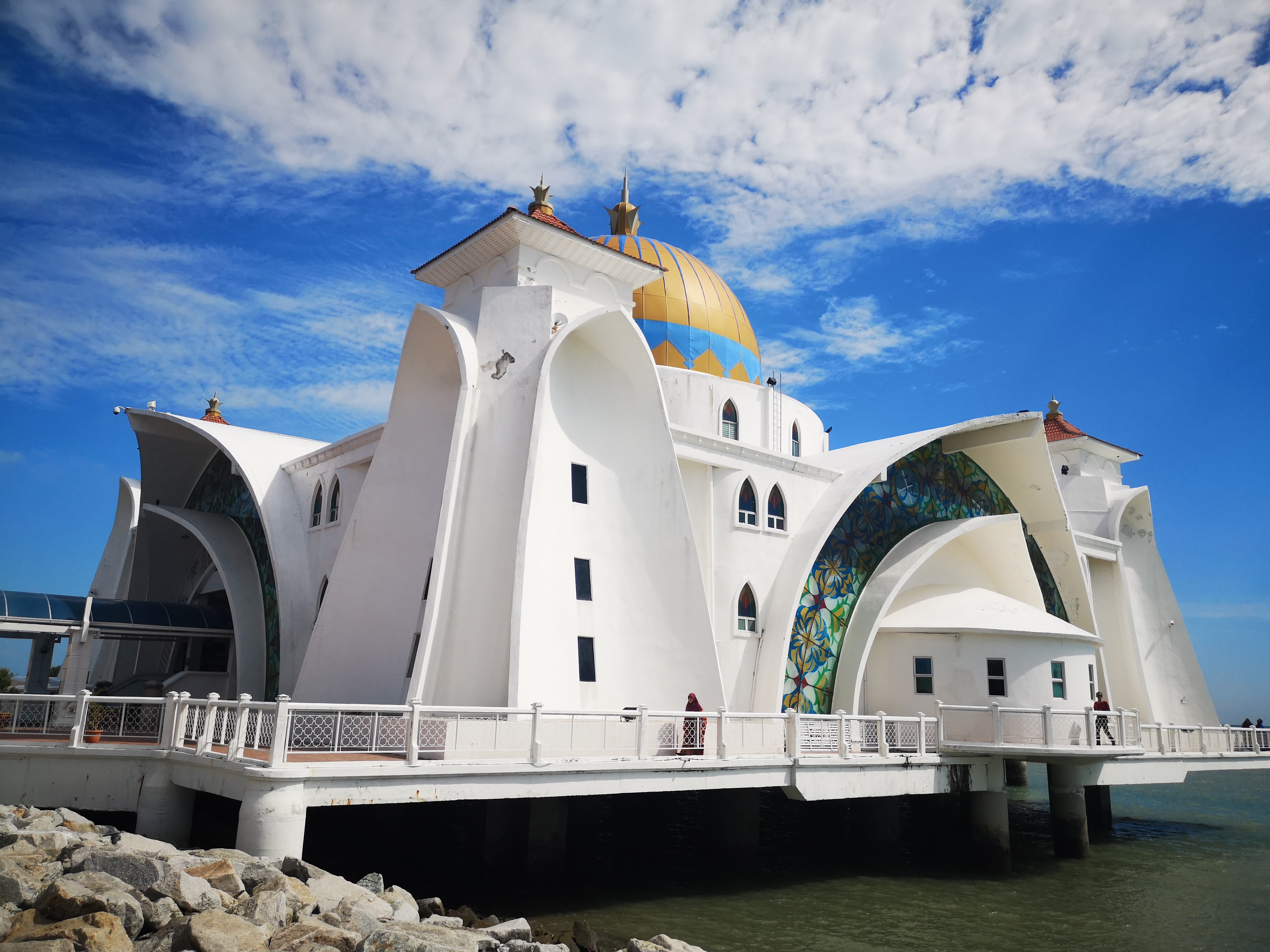 海峽清真寺面對著馬六甲海峽,旁邊有塊立牌,寫著「馬六甲海峽-世界最長既最繁忙的海峽」,遊客可以站在這裡眺望整個馬六甲海峽,想像過去繁忙的航海時代,明朝時鄭和七次下西洋,大航海時代,葡萄牙、荷蘭、英國相繼佔領這塊土地。