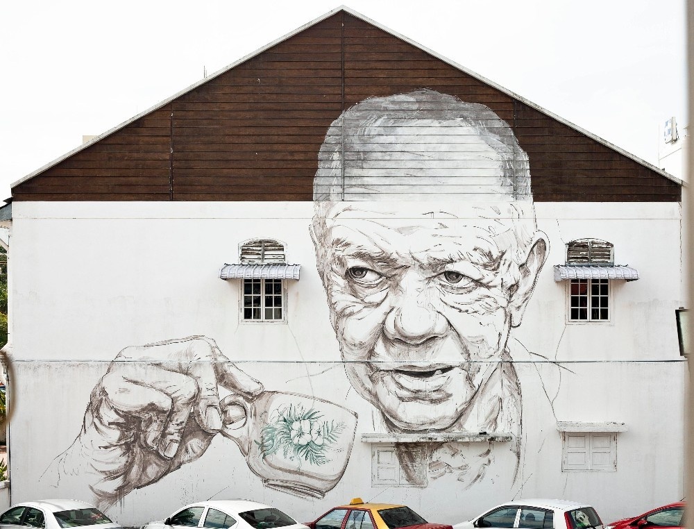 怡保舊街場分店外有個巨型壁畫“老人和咖啡杯”。老人手上的青花陶瓷杯,也是一般民眾喝白咖啡用的杯子。這種杯子在盛入咖啡前會先用熱水汆燙過再倒咖啡,非常在地和懷舊。